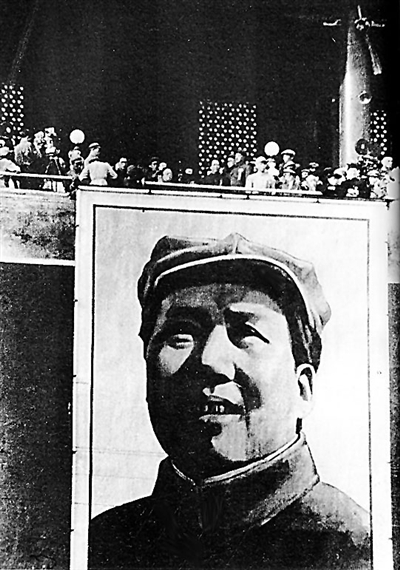 天安門城樓大殿的東山墻下搭起了一座6米多高的杉木架子。北平國立藝專實用美術(shù)系教師周令釗帶領(lǐng)他的學(xué)生、助手陳若菊等,正站在高架子上繪制毛主席巨幅畫像:毛澤東頭戴八角帽,臉部稍側(cè),目光仰視,微帶笑容,顯露出高瞻遠矚的偉人氣質(zhì)。原照片是新聞攝影局的鄭景康1945年6月在延安時拍攝的。照片上毛主席身穿的粗呢子制服還是在延安大生產(chǎn)后王震的359旅戰(zhàn)士為毛主席制作的。這是當時在解放區(qū)最流行的一張領(lǐng)袖像,而且是經(jīng)毛澤東本人親自選定同意的。