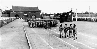 隨后,毛澤東等領(lǐng)導(dǎo)人乘車(chē)出中南海東門(mén),從故宮西華門(mén)南拐至闕右門(mén),再往南直達(dá)天安門(mén),登上了城樓的100級(jí)臺(tái)階……