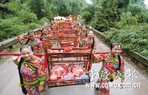 “人逢喜事精神爽,不知不覺就走攏了;恭喜主人,花轎來到你家門;你姑娘打扮好沒有?迎親隊(duì)伍都到了喲……”媒婆打招呼,成了新娘出閣特定的開場白。與女方對(duì)答完后,媒婆一聲“把禮盒抬進(jìn)去”,男方迎親隊(duì)伍中的總管即出列呈上禮單。之后,新娘“忙”起了上花轎前的出閣儀式:踩斗、丟筷子、罵媒、父親壓轎、哥哥背上轎、哭嫁。
