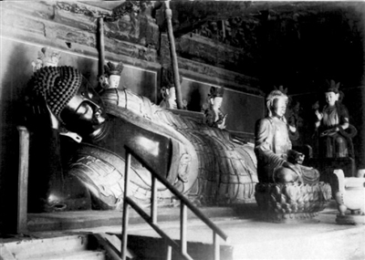 西山臥佛寺的老照片更讓文史工作者吃驚不已,照片中巨大的5萬斤臥佛腹前,竟然還有一尊端坐蓮花座、有臥佛四分之一大小的坐佛。而在古籍中,并沒有臥佛前還有一尊坐佛的記載。因此,西山臥佛寺有了兩個謎團:即元代沒有大型運輸設(shè)備,重達25000公斤的臥佛是怎樣運上山的?臥佛前何時有了小坐佛?目前,這些問題正在進一步考證。