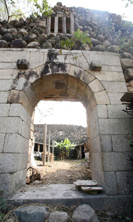 石堡是一個長方形建筑,長37米、寬31米,墻體內(nèi)外全是用鵝卵石及條石砌成,歷經(jīng)數(shù)百年風(fēng)雨,雖說已經(jīng)沒有了屋頂,只留下高約8米的墻基,但依然雄偉屹立。石堡的三面是護(hù)厝房,外墻也是石頭,但內(nèi)墻是由土夯成的,非常牢固,石堡大門上陰刻“懷珠”兩字。
