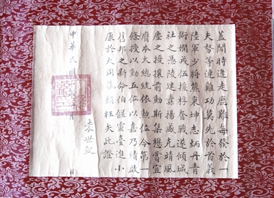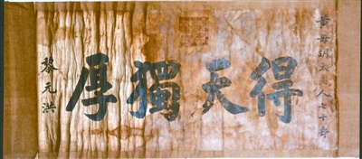1916年辛亥首義志士大黃申薌之母胡太夫人七十壽誕之際,時(shí)任民國(guó)大總統(tǒng)黎元洪為之題寫”得天獨(dú)厚“橫披,以賀其壽。據(jù)紀(jì)念館館長(zhǎng)梁華平介紹,受以往對(duì)其政治評(píng)價(jià)的影響,黎元洪手書真跡未受應(yīng)有重視,大多散失。這件“得天獨(dú)厚“橫披手跡更是彌足珍貴。 (記者 蔣太旭 通訊員 何廣 實(shí)習(xí)生 趙紅)