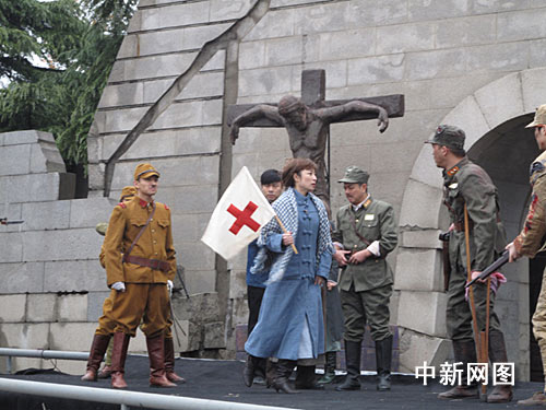 為紀(jì)念“南京大屠殺”事件爆發(fā)七十二周年,悼念南京三十萬同胞遇難七十二周年,為了讓廣大人民群眾尤其是青少年勿忘國恥,珍惜和平,為反映發(fā)生在南京的重大歷史事件,今天中午,南京市話劇團(tuán)在江東門“南京大屠殺遇難同胞紀(jì)念館”現(xiàn)場演出舞臺劇《淪陷》。