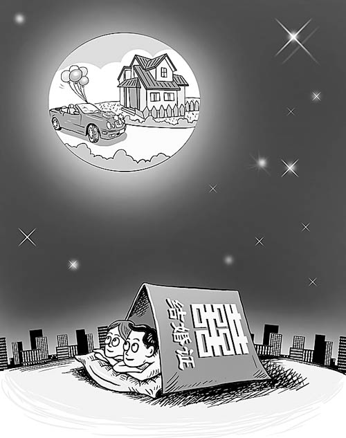 不買房,不買車,不辦婚禮,不買婚戒……除了花九塊錢去登記處辦理紅艷艷的結婚證,其他都可以不要。近來,網(wǎng)絡上的一篇題為“一個裸婚者的自白”的帖子,引發(fā)網(wǎng)友關注。“裸婚”,這個在2008年全球金融危機下誕生的新詞兒,在2009年不斷上揚的房價“助推”下迅速流行。新浪網(wǎng)網(wǎng)友“同道”稱,“‘裸婚’是高房價賜給白領的‘新時尚’!
