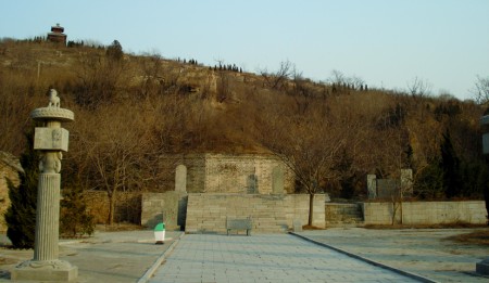 1 月6日,正值今冬最凜冽的天氣,村子里行人稀少,墓園里一片靜寂,兩扇朱紅色大門上面書有“曹植墓”三字,寒風(fēng)蕭瑟中,倍顯莊嚴(yán)肅穆。從側(cè)門進(jìn)入墓園中,一座低矮的山丘佇立,山上挺立的青松之間,各種叢木枝節(jié)盤繞,迎面便是青色古磚砌成的曹植墓。為防止雨水侵蝕,墓門現(xiàn)已經(jīng)封閉,無(wú)法進(jìn)入甬道和墓室。