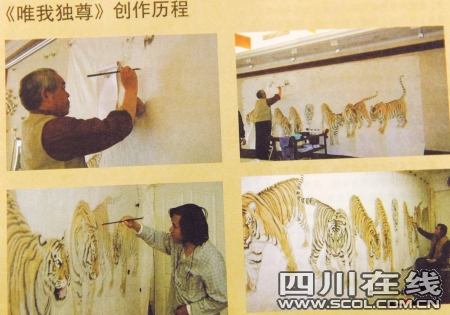 一個(gè)小時(shí)之后,事情出現(xiàn)了非常戲劇性的變化。不少關(guān)于《惟我獨(dú)尊》的照片和畫冊(cè)在同城某大廈的會(huì)議室里出現(xiàn),這里正召開(kāi)一場(chǎng)關(guān)于“打虎”的新聞發(fā)布會(huì),發(fā)布會(huì)的發(fā)起人尹青,是畫家孟祥順的好朋友,也是一名成都的律師,這次他是以孟祥順特別代理人的身份緊急約見(jiàn)成都媒體。尹律師義憤填膺地說(shuō):“現(xiàn)在正在長(zhǎng)江畫院展覽的《惟我獨(dú)尊》是百分之百的假貨,