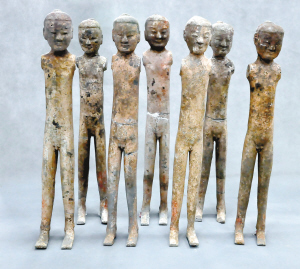 “這些陶俑與漢陽(yáng)陵的陶俑相似,大約60厘米高!睆堉倭⒄f(shuō),現(xiàn)在雖然看著陶俑都是赤身裸體,沒(méi)有胳膊,但在胳膊處都留有孔,而在坑內(nèi)專家們還發(fā)現(xiàn)了盔甲的殘片,可見(jiàn)這些陶俑原先都穿有各種各樣的衣服。而在坑內(nèi),出土了大量的兵器銅鏃、刀、箭等,還有十分少見(jiàn)的6金6銅的青銅鐘,還有做飯用的陶釜。