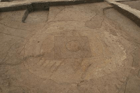 2、發(fā)現(xiàn)夯土祭壇,在山東地區(qū)尚屬首次發(fā)現(xiàn),國(guó)內(nèi)罕見(jiàn)。祭壇位于城內(nèi)南部正中偏西部位,距南墻21.5米。南北殘長(zhǎng)34.5米,東西殘寬19米,殘存高度0.7—0.8米。中心為直徑5.5—6米的圓臺(tái)形,向外依次為不同土色的方形、長(zhǎng)方形及圓形、橢圓形相套的夯筑臺(tái)基。外圍有多層厚5—12厘米不等的水平狀夯土堆積,間有白色沙土或灰燼薄層。祭壇邊緣多被晚期遺跡破壞,中心部位到春秋戰(zhàn)國(guó)時(shí)期仍然保存完好,其南北干道也從祭壇西側(cè)繞行,這表明,在戰(zhàn)國(guó)時(shí)期人們對(duì)祭壇仍然保持著某種程度的崇拜。