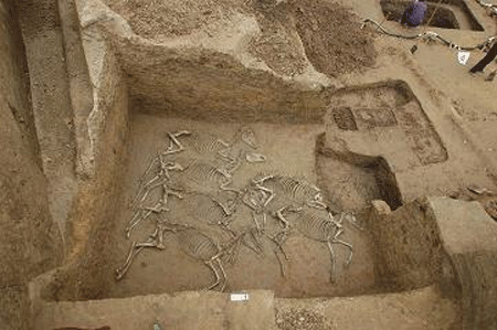 墓室上口長(zhǎng)6.2米、寬5米。墓道長(zhǎng)15.7米。兩座墓均為南北向,人骨均已散亂,器物箱內(nèi)都放置鼎、簋、盤、匜、矛等青銅器、車馬器和陶鬲;墓道內(nèi)均隨葬兩輛馬車和一只狗。墓葬出土玉器10余件,青銅器50余件,其中8件有銘文。在大墓與祭壇之間發(fā)現(xiàn)5座馬坑和1座車馬坑。馬坑僅有馬骨架,其中一座殉馬2匹;兩座殉馬各8匹,分兩排整齊擺放;兩座殉馬各6匹,其一分兩排擺放,前2后4,另一座為兩兩成對(duì)放置,頭向不一,中間放置一件牛角。車馬坑長(zhǎng)14米,寬3.4米。內(nèi)置3輛車,前兩輛皆四駕,后一輛兩駕。馬頭上均有精美的青銅和串貝飾件。因天氣和水位過(guò)高,現(xiàn)正在對(duì)車馬坑進(jìn)行整體提取,移至室內(nèi)清理。