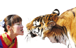 晁改敏被蘇州人熟悉,是在去年11月。那時(shí),她所在的馬戲團(tuán)與蘇州白象灣景區(qū)正式簽約,她和丈夫也告別了各地流動演出的生活,帶著英雄虎爸虎媽和它們的兩只虎寶寶,在蘇州暫時(shí)定居。白象灣景區(qū)開園的時(shí)候,晁改敏表演了叼肉喂虎節(jié)目,此前她曾因此節(jié)目,被譽(yù)為中國第一馴虎女郎。當(dāng)她叼著肉,老虎從她的嘴邊把肉吞下時(shí),她的口與虎口近乎零距離。此后,游人多的時(shí)候,晁改敏總會表演這一節(jié)目,晁改敏也因此在蘇州名氣響亮。