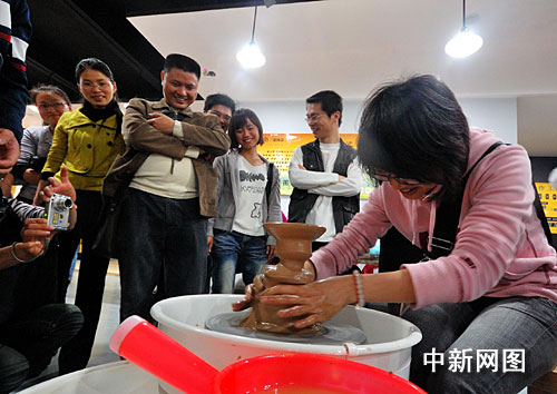 制作現(xiàn)場(chǎng)上,優(yōu)美動(dòng)聽的古箏樂(lè)曲不停地繚繞盈耳,瓷藝家們或捏或雕,或刻或鏤,或推或接,各種傳統(tǒng)技法紛紛上陣,精彩紛呈。這行云流水般的手法、精妙細(xì)致的做工、別出心裁的設(shè)計(jì),讓參觀者看得眼花繚亂,贊嘆不已,為之折服。人們?nèi)滩蛔∩锨懊幻?xì)膩的瓷泥,轉(zhuǎn)一轉(zhuǎn)工作盤,拿一拿精致的制作工具。前來(lái)參觀的顏小姐不禁挽起袖子也親身體驗(yàn)了一回手拉坯。在轉(zhuǎn)盤的帶動(dòng)下,顏小姐雙手輕拉瓷泥,那團(tuán)柔軟的瓷泥仿佛有了靈性一般“舞蹈”起來(lái),一會(huì)變成一個(gè)款嘴的大海碗,一會(huì)又變成一個(gè)細(xì)腰的小花瓶。舉著滿手的瓷泥,顏小姐開心地說(shuō):“太有意思了,讓我想起小時(shí)候玩泥巴的情景!彼表示:“下次有空的時(shí)候,我一定還要再來(lái)玩手拉坯,DIY一件作品做紀(jì)念!