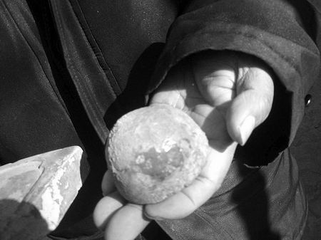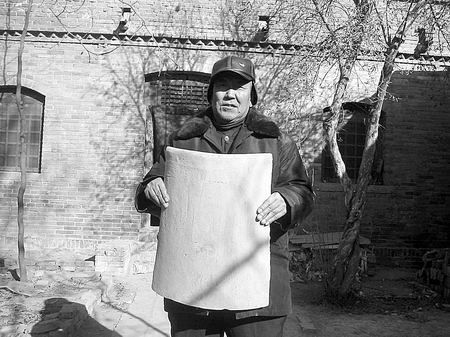記者在龍振山處不但見(jiàn)到大如饅頭的“門釘”,而且還看到他在西高穴收集的大如簸箕的瓦片,長(zhǎng)與下寬足有50多厘米,龍振山持于身前,遮蓋了半個(gè)身子。
