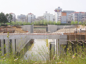 記者趕到西廣場時發(fā)現(xiàn),遺址上是一片火熱的施工景象,現(xiàn)場堆滿了各種建筑材料,幾十個工人穿梭忙碌,工地上還可以見到類似砌城墻所用的巨大條石。從廣場西邊的外秦淮河邊望去,新建的混凝土水閘幾乎東西向貫通遺址,已經(jīng)基本成形,F(xiàn)場一位工人告訴記者,這里將建一個賞心亭,水閘還將穿過馬路,連通內(nèi)外秦淮河。