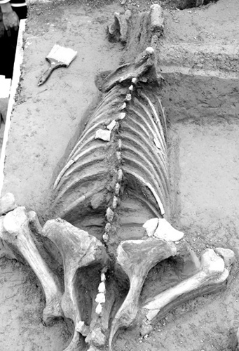 參與發(fā)掘的中國(guó)社科院考古所副研究員李存信說,以往發(fā)掘的墓葬中陪葬馬匹一般為側(cè)臥,直立的并不多見。他初步推斷,馬所處的馬槽是專門用于固定馬的站立姿勢(shì)的,由于沒有掙扎的痕跡,馬應(yīng)是死后被人卡在槽中,才得以保留了現(xiàn)在的姿勢(shì)。