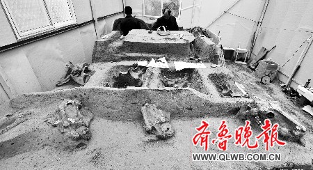 省文物考古研究所所長鄭同修介紹,車馬坑及馬坑等重要遺跡整體起取至濟南后,就采取了初步的防護措施,建設(shè)了臨時保護和工作用房,制定了保護工作方案。