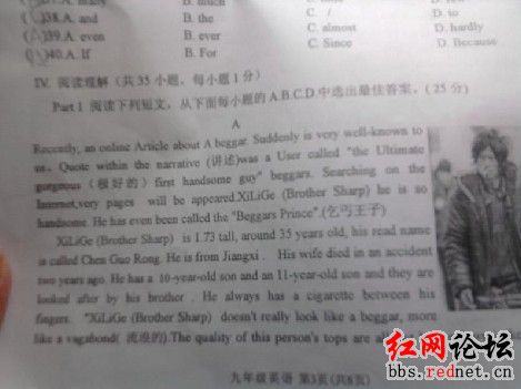 從紅網(wǎng)高校論壇相關(guān)截圖中,網(wǎng)友可以清晰地看到試卷是九年級(jí)英語試卷。試卷內(nèi)容簡(jiǎn)單介紹了“犀利哥”在網(wǎng)絡(luò)上的突然出現(xiàn),并被稱為“乞丐王子”引起了網(wǎng)民的關(guān)注,并在第二段對(duì)“犀利哥”的身世等做了一個(gè)簡(jiǎn)單的介紹。
