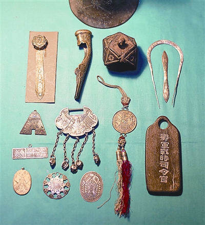 昨日,在其武昌家中,朱漢昌向記者展示了他所收藏的部分繪制有“雙旗”圖案的辛亥紀念實物,包括當(dāng)時的革命將領(lǐng)使用的佩劍手柄、軍政府的出入證、紀念章、各類佩飾、碗碟等,其材質(zhì)涉及金、銀、銅、鐵、紙、木、瓷、皮、布等。