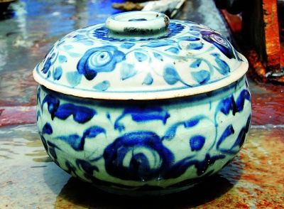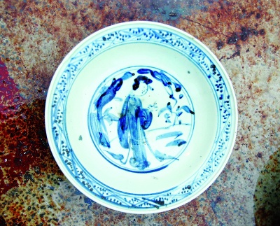 目前見到的文物種類主要是青花瓷大盤,此外也有青花瓷缽、青花小酒杯、青花碗、貼塑龍紋罐、銅板、鐵器及金屬凝結(jié)物等等。崔勇介紹,其中青花瓷大盤和帶蓋青花瓷缽是有代表性的器物,瓷胎和釉質(zhì)比較厚重,青花顏色不太鮮亮,發(fā)灰或者發(fā)黑,無論人物還是花草圖案都比較隨意,器表施滿釉,底足粘有細砂,即“砂足器”,屬于外銷瓷中的常見類型。