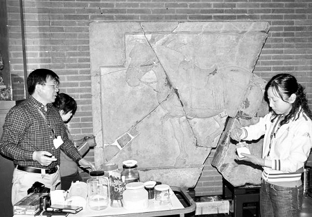 在完成了一系列的前期試驗準備工作之后,當?shù)貢r間5月18日,西安赴美的文物修復專家與美方專家一道開始對“二駿”本體實施修復,工作由實驗室研究轉至為文物實體的補全。