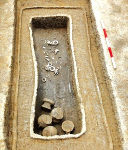 據(jù)介紹,今年3月初,浙江省文物考古研究所和余杭博物館聯(lián)合對(duì)玉架山遺址繼續(xù)進(jìn)行發(fā)掘、探索。本年度發(fā)掘至今,清理良渚文化墓葬32座(共200座);可能存在房址的東北角附近已著手發(fā)掘。依照計(jì)劃尋找遺址對(duì)外通道,解剖了環(huán)壕東北角向北延伸的部分(鉆探時(shí)推測(cè)為北通道),獲知解剖點(diǎn)的北通道寬約9.5米,深1.5米。在距北通道西側(cè)約30米處發(fā)現(xiàn)了另一小遺址,清理了一條東西向小溝(局部),在小溝的北岸壘有一些石塊,并發(fā)現(xiàn)了良渚文化晚期小墓墓地,暫時(shí)清理了其中一座。