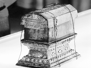記者看到,整個啟請過程中稍微有點難度的就是須彌座的長方形金棺銀槨。這套金棺銀槨長和高約為15厘米,寬約六七厘米,槨蓋上有細密的花紋,前頭還垂下了兩重屋檐。槨身四周有持金剛杵的天王或力士站在門前,代表天龍八部,即佛祖的護衛(wèi);還有吹笛和排簫的天女天象,衣帶飄飄仿佛凌空飛行。須彌座是由佛座演變來的,這個銀槨的造型明顯寓意佛祖居住的宮殿。銀槨內是一個小一號的金棺,用金絲捆扎,防止棺蓋滑脫,F場,專家們用手輕輕“推”著捆綁的金絲,沒用幾分鐘,就解開了千年謎底,露出了里面的佛頂真骨。