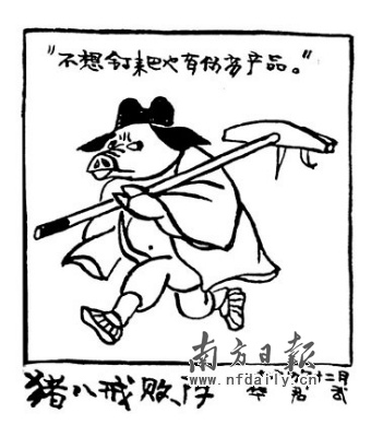 “文革”結(jié)束后,華君武出任全國美協(xié)副主席。這個時期華君武特別喜歡畫豬八戒。他認為人性中的弱點,豬八戒幾乎大都具備。上世紀80年代假冒偽劣產(chǎn)品出現(xiàn),他揮筆創(chuàng)作《豬八戒敗陣》,畫中的八戒之所以敗陣,就因沒想到連他用的釘耙也是假冒偽劣產(chǎn)品,因而打了敗仗。因為這一系列諷刺作品,有人形容華君武的漫畫是“刀刀見血,入木三分”。
