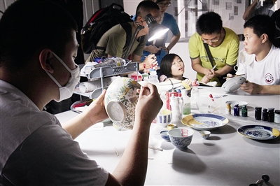 現(xiàn)場(chǎng)修復(fù)間與外面的文物展示區(qū)僅隔一道玻璃,觀眾在展示區(qū)參觀圓明園出土瓷片和老照片時(shí),也可以近距離觀看文物修復(fù)過(guò)程。