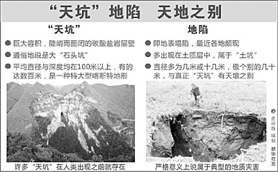 專家指出:“天坑”頻現(xiàn),這樣的用語足以駭人。然而根據(jù)地質(zhì)學(xué)定義,真正的“天坑”是指具有巨大容積,陡峭而圈閉的碳酸鹽巖層壁,通俗地說這是一種大“石頭坑”,其平均直徑與深度均在100米以上,有的達到數(shù)百米。它是一種特大型喀斯特地形。許多 “天坑”在人類出現(xiàn)之前就早已存在。