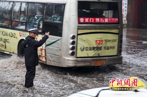 上午9時(shí),武漢市京漢大道武勝路口出現(xiàn)漬水,最深處積水達(dá)40cm,一些小轎車駕駛員由于不了解漬水深度盲目行車而致機(jī)動(dòng)車熄火。因該路段過(guò)往車輛頻繁,漬水容易造成道路堵塞,一些民警站在水中充當(dāng)路標(biāo),為車輛安全行走引導(dǎo)方向。