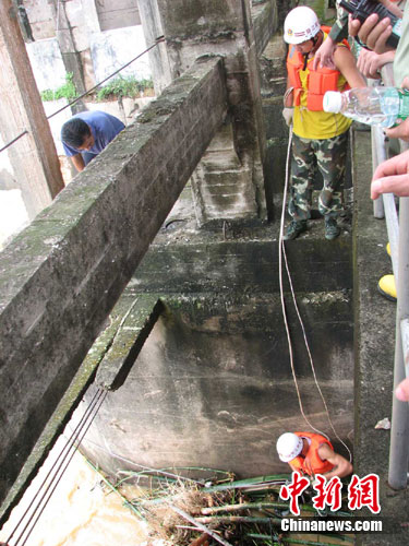 大壩閘門下,水深近6米,水流異常湍急,洪水也異常冰冷,且堆滿了垃圾,雖然消防官兵做好了安全保護(hù),并關(guān)好閘門,下游也安排了漁船隨時(shí)準(zhǔn)備救人,但是水下的情況不明,一不小心就有被洪水沖走或被水下雜物扎傷的危險(xiǎn)。在其中靠近岸邊的一個(gè)孔閘門,大樹與竹子卡在閘門的中間,閘門無法放下,消防官兵只能在異常湍急的水流中作業(yè),由于缺少著力點(diǎn),水下的消防官兵多次沒入水中,險(xiǎn)象環(huán)生,經(jīng)過近20多分鐘的作業(yè)才將雜物捆住。