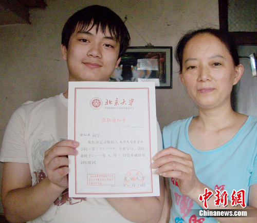 中新網(wǎng)重慶7月15日電 (連肖) 從徐仁洋接到北京大學(xué)的錄取通知書至今,母親楊治群已連續(xù)兩天晚上睡不著覺(jué)了!拔宜恢话胧且?yàn)榕d奮,另一半則是惆悵!睏钪稳赫f(shuō),他們一家三口 “蝸居”在重慶一個(gè)月租200元的出租房里,固定經(jīng)濟(jì)來(lái)源是每月260元的低保費(fèi),家中連兒子去北京的路費(fèi)都拿不出來(lái),更別說(shuō)高昂的學(xué)費(fèi)了。