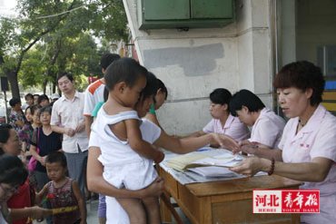 昨日7時(shí)許,家住石市新石小區(qū)的孟先生就帶著孩子來到橋西區(qū)婦幼保健站,不料前面已排起長隊(duì),身后還陸續(xù)有家長帶著孩子趕來。