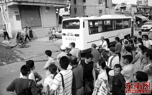住在路邊四樓的周小姐目睹了車禍發(fā)生的經(jīng)過(guò)。她告訴記者:“當(dāng)時(shí)我正站在陽(yáng)臺(tái)邊梳頭,大約7:50的時(shí)候,一輛大客車從西邊開(kāi)過(guò)來(lái),車速不是很快。開(kāi)到我樓下時(shí),我看到車撞到了一個(gè)小女孩和一個(gè)老人,然后車子又繼續(xù)往下開(kāi),緊接著撞到一前一后兩名婦女,又撞到一名騎著三輪車的男子,最后左轉(zhuǎn)彎停下了!