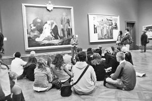 2007年11月底,記者在英國倫敦采訪時,在一個周三的晚上參觀了英國國家畫廊,在一個展廳正巧碰上一位老師在給十幾名中學(xué)生上課。學(xué)生在一幅名畫前席地而坐,老師在前面侃侃而談,解釋這幅畫作的歷史背景、色彩運(yùn)用、光線處理。展廳的工作人員告訴記者,各個學(xué)校只要預(yù)約,都可以在規(guī)定的時間里在美術(shù)館給學(xué)生上課,而國家畫廊也有專門的解說員可以為中小學(xué)生免費(fèi)義務(wù)講解。