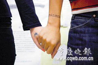 25歲的小海是墊江縣人,就讀于重慶大學(xué)B區(qū)土木工程學(xué)院。大四時(shí),小海和同系女孩小麗相戀。一次,小海從網(wǎng)上了解到,國(guó)外不少戀人喜歡在各自的身體上文上相同圖案,以此表達(dá)愛(ài)意,他便和小麗同在左臂上文上了一個(gè)“龍”字!拔覀兠掷锒加羞@個(gè)字,文上它,誰(shuí)都知道我們是一對(duì)!