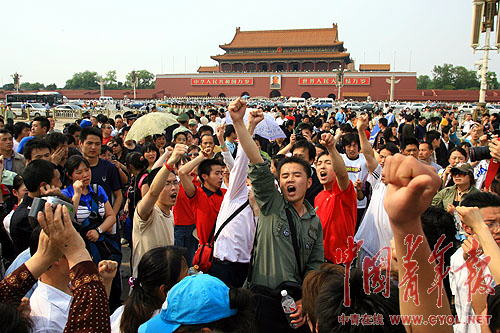 5月19日下午,天安門(mén)廣場(chǎng)上聚集了數(shù)萬(wàn)名參與哀悼活動(dòng)的群眾,在默哀完畢后,此起彼伏的“中國(guó)萬(wàn)歲”、“中國(guó)加油”的聲音響徹云霄。幾名四川籍在京大學(xué)生用四川話(huà)激昂高呼“四川雄起”,在場(chǎng)的四川人奮起響應(yīng),很快,來(lái)自全國(guó)各地的人們都受到強(qiáng)烈的震動(dòng),一起吶喊起來(lái),一聲聲感人肺腑的吶喊聲在天地間回蕩,一雙雙舉著國(guó)旗的手臂在廣場(chǎng)上有力的揮舞,廣場(chǎng)漾起了一片血色的愛(ài)國(guó)暖潮。