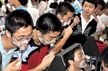 昨天下午的復(fù)旦相輝堂大禮堂里,500名大一男生濟濟一堂,每個人的座位前都擺了一面鏡子和剃須刀及剃須啫喱,男生們有些新鮮地摸著這些東西。