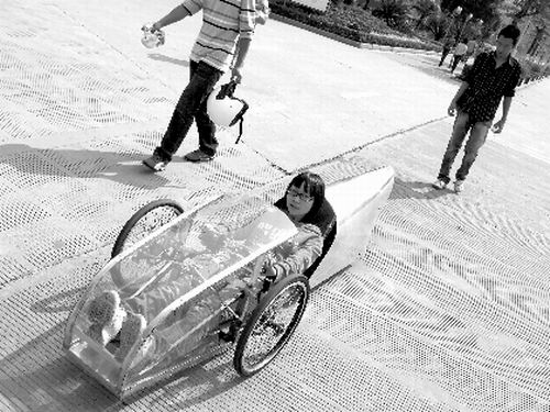 經(jīng)2個月的定型,2個月的組裝后,一個漂亮的成品汽車終于亮相了。這輛耗資2萬元,時速達100公里的小汽車車身設(shè)計呈流線型,車手只能伸直腿半臥在駕駛室里,比F1賽車的車倉還小。制造好汽車后,開始在全校選拔符合駕駛要求的車手,由于汽車屬機動車,必須持有C照以上的駕照,同時還要對車的性能很了解,而個子也需要矮小才行。最終身材嬌小的女生周卓同學(xué)脫穎而出成為了賽車手。