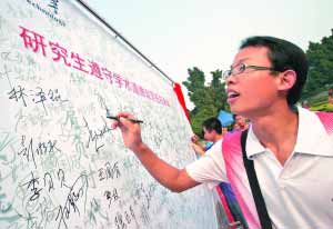 昨日(23日)下午,華南理工大學(xué)舉行第十五屆研究生文化節(jié)開幕儀式,本屆活動的“學(xué)術(shù)道德宣誓”和“千人學(xué)術(shù)道德大簽名”屬高校首創(chuàng)之舉,上千名研究生由研究生會主席帶頭舉行學(xué)術(shù)道德集體宣誓尤其壯觀,并在簽名板上簽名,以表達對學(xué)術(shù)抄襲的反對態(tài)度。