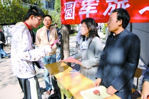 在現(xiàn)場宣傳征兵工作的,有一些退伍的大學(xué)生。他們用親身經(jīng)歷和感受,鼓舞著欲報(bào)名參軍的大學(xué)生。王喜慶是在2005年應(yīng)征入伍的,現(xiàn)在已重新回到課堂。他說:“新一代的大學(xué)生對參軍的認(rèn)識已經(jīng)有所改變,‘參軍就是吃苦’的認(rèn)識,太落伍了。因?yàn)椋筷?duì)的條件在不斷改善,居住、飲食、通訊、補(bǔ)助各個(gè)方面都很到位,很人性化。”