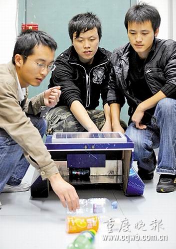 “我們發(fā)明的機器人會撿礦泉水瓶和塑料袋,還會掃地……我們將把它作為畢業(yè)紀念品送給學(xué)校!弊蛉(10月29日),重慶交通大學(xué)機電與汽車工程學(xué)院的大四學(xué)生胡偉平、謝敬濤、王定坤等五位同學(xué)將發(fā)明的“保潔機器人”贈送學(xué)校,作為回報母校的禮物。