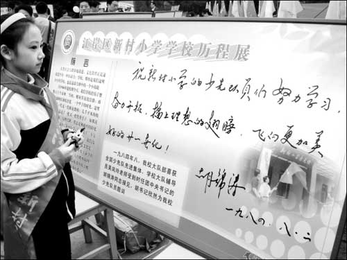 1984年8月2日,新村小學(xué)少先大隊(duì)喜獲全國(guó)少先隊(duì)先進(jìn)集體稱(chēng)號(hào),該校大隊(duì)輔導(dǎo)員吳鳳玲老師受到胡錦濤的接見(jiàn)。胡錦濤欣然為該校少先隊(duì)員題詞,激勵(lì)了一代又一代少年學(xué)子。