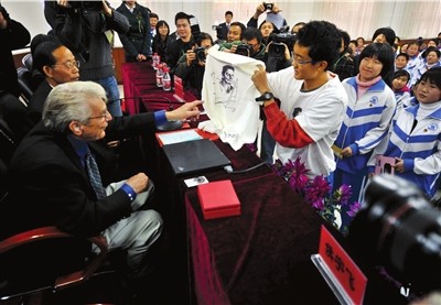 昨天(11月11日,下同)上午,2008諾貝爾獎獲得者北京論壇在人民大會堂開幕,7位諾貝爾獎獲得者和4位圖靈獎獲得者來京論道。當(dāng)天下午,兩位諾獎得主分別前往三帆中學(xué)和北京理工大學(xué),和大中學(xué)生們面對面交流。三帆中學(xué)每個班級都提前制作了立志信物贈送給大師。