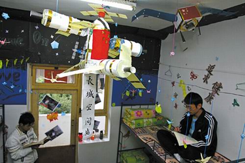 據(jù)了解,設(shè)計(jì)出這個(gè)寢室的是西南大學(xué)2008級(jí)植物保護(hù)學(xué)院的6名男生,這6人清一色的都是航天迷,家里關(guān)于宇宙、航天之類的書籍和影像資料幾乎可以堆成山。其中黃貴強(qiáng)更可謂入迷至極,他不僅對(duì)“神舟飛船”宇航員的各種小秘聞了如指掌,更對(duì)飛船的各個(gè)部件有著一定的研究,最大的愿望是成為一名航天員。為此,他還專門整理出所學(xué)知識(shí),將其貼在寢室門口。