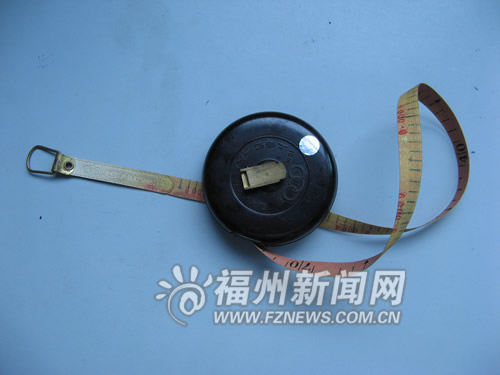這尺為皮帶型的布帶尺,全長(zhǎng)50米。尺的正面為黃色,刻度為米,稱(chēng)為黃尺;背面為紅色,刻度為“毫”,稱(chēng)為紅尺。