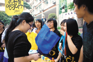 學(xué)校新開了射擊場?別誤會,這是高一一班男生盧布布開的檔口——“布布射擊場”!耙郧案杏X政治課的價值規(guī)律很抽象,現(xiàn)在終于能理解!北R布布說,“如商品多競爭大,賣的商品怎樣才能吸引顧客?一要價格方面比學(xué)校和外面地攤都要低,又要賣別人不賣的東西。”其中一名組員是學(xué)校公關(guān)部部長,由于有一定的和企業(yè)打交道的經(jīng)驗,懂得怎樣別出心裁地“打響招牌”。最后他們借鑒了廣場的娛樂元素,讓射擊中獎?wù)呖色@得食模玩具獎勵,同時布布還戴上兔耳朵舉牌攬客,這樣招攬了不少顧客!艾F(xiàn)在終于體會到父母‘揾食’的艱辛了,”盧布布說,現(xiàn)時學(xué)業(yè)繁重,擠出時間進貨,晚上11、12點才回家,光挑貨也挑上一小時,而且內(nèi)部在進貨種類上還存在分歧。后來,布布還是讓十余個組員每人負責(zé)不同的細項,他們的“企業(yè)”才順利建起,“要辦好一家企業(yè),團隊協(xié)作非常重要!”最后射擊場銷售額700元,盈利200多元,布布表示,更重要的是通過這次活動,體會到和社會接軌的感覺。