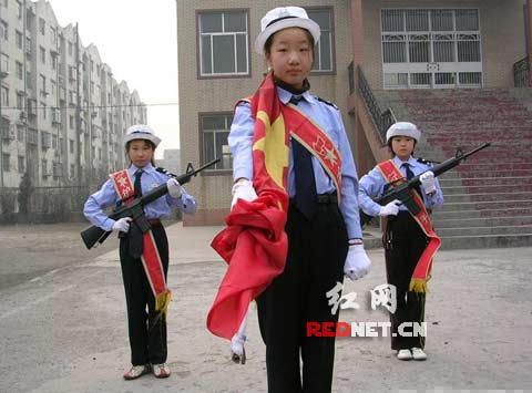 “拿美式槍,護(hù)咱的旗,咋看咋別扭!”23日晚上,網(wǎng)友“鍋爐工”在紅網(wǎng)論壇發(fā)帖爆料,稱在網(wǎng)易論壇、鐵血社區(qū)及貓撲大雜燴等網(wǎng)上看到一張雷人圖片:三小學(xué)生身穿交警服,其中兩名手拿M16自動步槍護(hù)旗。按說這應(yīng)是仿真槍,可學(xué)校如此 ‘推陳出新’真把俺給嚇到了。不過,也有網(wǎng)友認(rèn)為可能是有人擺拍的惡作劇,或表演什么的。