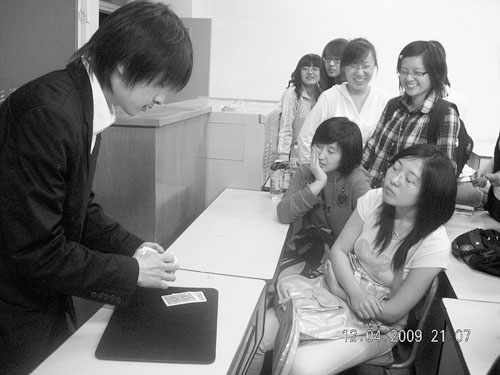 接著,會有一位“資深社員”上臺教授新魔術,因為活動場地有限,教的一般都是手彩魔術,“只要一開始表演,社員們就一下子都擁到我們身邊,把我們圍住,看得特別認真。”李魏林說。