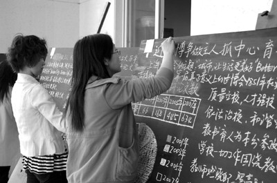 晚報(bào)訊 為提高教師教學(xué)基本功,上海第二工業(yè)大學(xué)日前舉行以“迎世博爭做主人、抓中心育人為本”為主題的教職工板書競賽,首次邀請學(xué)生做評委給老師打分。由各學(xué)院選拔出的35名教師分老、中、青三個年齡組進(jìn)行比賽,評分標(biāo)準(zhǔn)由版面構(gòu)思合理、用規(guī)范字、筆畫清楚有力等方面組成。比賽裁判組邀請了各學(xué)院教學(xué)院長等18 人進(jìn)行現(xiàn)場評分,同時首次邀請30位學(xué)生學(xué)習(xí)委員代表一起參與評分。比賽現(xiàn)場吸引了數(shù)百名教職工前來觀摩、取長補(bǔ)短。 □記者 肖波 攝影 蔣世偉