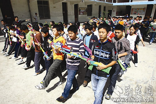 荊楚網(wǎng)消息 (楚天都市報) (記者張皓 攝影:記者魏錸)昨日下午,武漢市第59中學(xué)上百名學(xué)生,手持各式“槍支”在學(xué)校操場上走正步,體驗“閱兵”的感覺。據(jù)介紹,該校最近嘗試新課改,將美術(shù)課與軍訓(xùn)、體育鍛煉結(jié)合進(jìn)行,這些槍支是在近兩個星期的美術(shù)課上,同學(xué)們利用紙盒等廢棄物自己動手制作的。